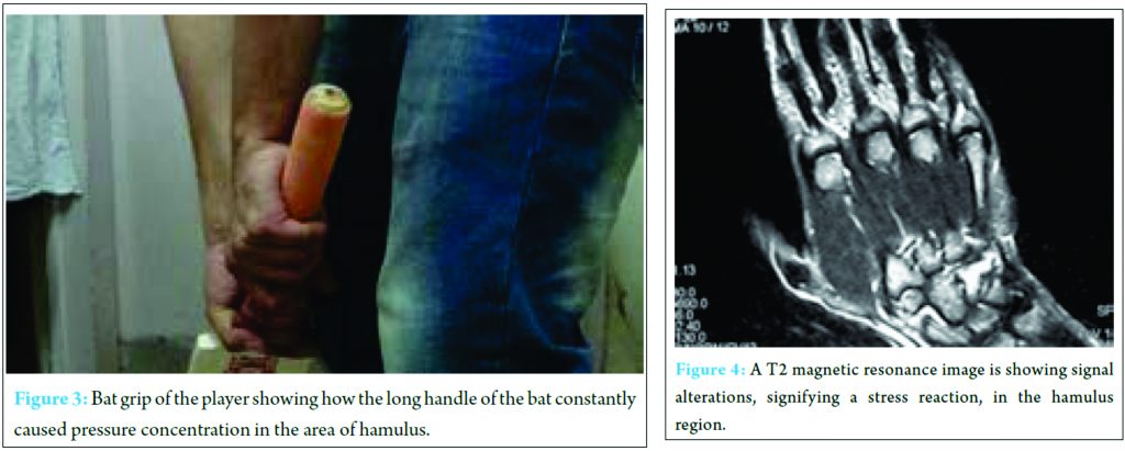 Case Report: A 23-year-old, right-handed, cricket batsman presented with pain in the hypothenar region of his left hand of 7 weeks duration. The pain typically worsened during batting, and he had difficulty in gripping the bat. Plain radiographs were largely inconclusive; magnetic resonance images, however, demonstrated a stress fracture of the hamate hook. The patient was put on conservative management, and his bat grip was modified. He recovered completely within 12 weeks and went back to playing professional cricket.