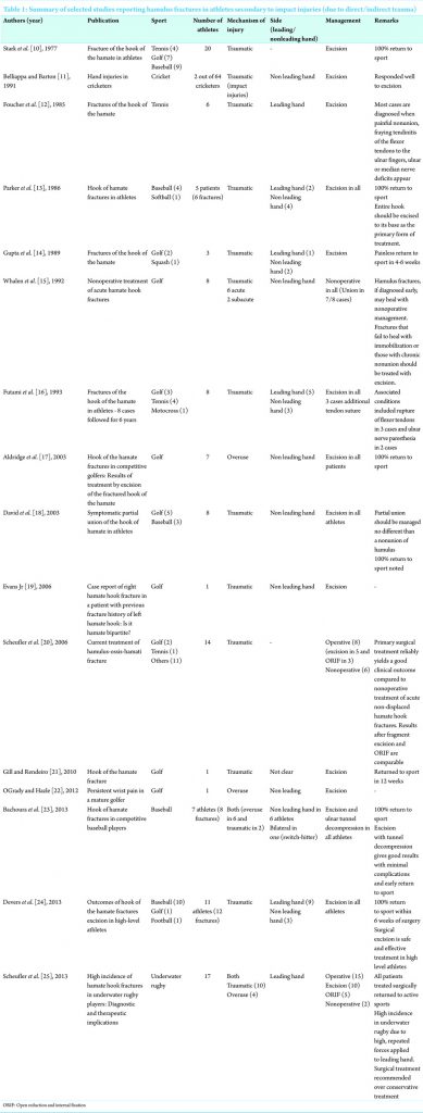 Hamulus (hook of hamate) fractures comprise 2-4% of carpal fractures [5,6,7]. These fractures are usually seen in sportspersons. First described by Milch [8] in 1934, many subsequent articles in literature detail the incidence, diagnosis, management, and complications of this fracture in different sports (Table 1) [9,10,11,12,13,14,15,16,17,18,19,20,21,22,23,24,25]. Hamulus fractures are usually seen in sports such as baseball, golf, and tennis where a bat or racquet is used by the athlete [7]. The nondominant hand is reportedly injured by swinging a baseball bat or golf club, whereas the dominant hand tends to be more at risk in tennis and other racquet sports [26].