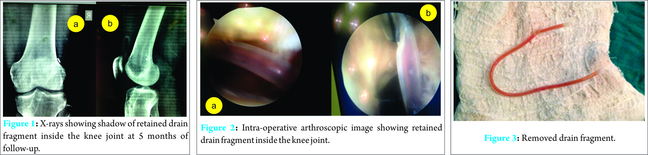The use of surgical drains is associated with an avoidable complication of breaking of drain and retention of broken drain fragment [1].This can cause significant embarrassment to the surgical team and increased harassment to the patient as it usually requires a return to the operating room to extricate the retained drain fragment [2]. It is detrimental socially, economically, and functionally. Furthermore, it can cause limitation or delay of sportsperson’s return to pre-injury level of sports activity.The use of surgical drains is associated with an avoidable complication of breaking of drain and retention of broken drain fragment [1].This can cause significant embarrassment to the surgical team and increased harassment to the patient as it usually requires a return to the operating room to extricate the retained drain fragment [2]. It is detrimental socially, economically, and functionally. Furthermore, it can cause limitation or delay of sportsperson’s return to pre-injury level of sports activity.We present a case of breakage of surgical drain during the removal and retention of the broken drain fragment inside the knee joint of an international kabaddi player after arthroscopic anterior cruciate ligament (ACL) reconstruction. We were unable to find any such report in the literature.