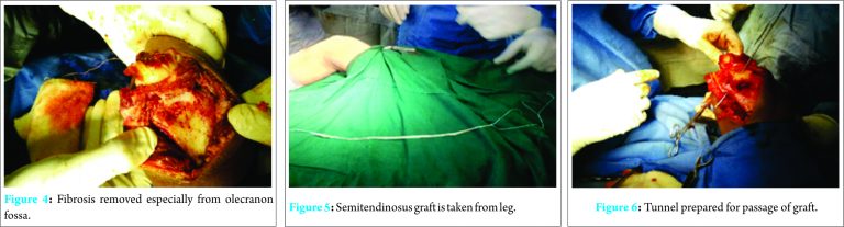In remote areas due to poor access to proper medical facilities and due to lack of awareness old unreduced elbow dislocations are common. Such patients are often neglected and maltreated before being seen by a specialist. Most surgeons recommend closed reduction for elbow dislocation up to 3 weeks post injury. After 3 weeks development of soft tissue contracture and osteoporosis makes closed reduction dangerous as manipulation may lead to fracture of the bone or damage the articular surface [4,5,6] most of surgeons advise open reduction for elbow dislocation up to 3 months; total elbow arthroplasty; excisional arthroplasty, or arthrodesis is advised thereafter. Speed (1925) introduced the method of triceps lengthening using V-Y plasty to reduce old dislocations of elbow [7]. The same method has been followed by many authors all throughout the century such as Billet [8], Naidoo [6], and Fowles et al. [9]. The technique essentially consists of extensive release, V-Y plasty and K-wire fixation for 2-4 weeks post-operative followed by aggressive physiotherapy. However, all of them use K-wire or plaster of Paris cast immobilization postoperatively for a varied amount of time. The only exception being Arafiles et al. [3], who have tried to create an intra-articular cruciate ligament-like structure using palmaris longus of the patient to provide immediate anteroposterior stability to the patient. This could avoid a K-wire fixation and give early movement to the patients. We have used semitendinosus tendon instead of palmaris longus for our patient. Proper dissection techniques avoided injury to collaterals ligaments and articular cartilage. Important purpose of cruciate ligament reconstruction is early mobilization. We started mobilization on next day only with our physiotherapy department. Good post-operative analgesia and proper motivational support helped to start active movements early. We got satisfactory results.