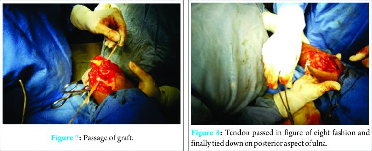 A technique originally published by Arafiles et al. [3] involved construction of an anterior-posterior cruciate ligament like structure using the palmaris longus tendon, but we harvested semitendinosus (Fig. 5) for our surgery .Total four holes are made using drill, two each in the humerus and ulna to pass the tendon through them in a figure of eight fashion (Fig. 6). The tendon passes through the articular surface of the olecranon and enters the articular surface of trochlea, winds back on the lateral condyle and passes the ulna to be finally tied down on the posterior aspect of ulna (Figs. 7 and 8).We released more contracted tissue until we were achieved full range of motion. We checked for both anteroposterior and mediolateral stability during various degrees of flexion and supination pronation and adjusted our slings likewise. At the end of procedure, we succeeded in achieving good stability which was confirmed by testing ROM in all planes. Wound closed in layers and drain kept in situ (Fig. 9). Above elbow slab given postoperatively and later drain was removed after 24 h (Fig. 10 post-operative X-ray). We allowed movement on the very next day of operation. Post-operative analgesic care was taken to allow pain-free movements. Active movements and gradual strengthening exercises started over a period of 3 weeks. Light weight lifting was given after 4 weeks and full weight lifting after 3 months. Follow-up was done at 3, 6, and 12 weeks and then after 3 months. In our case, we assessed for any pain, range of movements, and stability. Radiographic evaluation was also done.