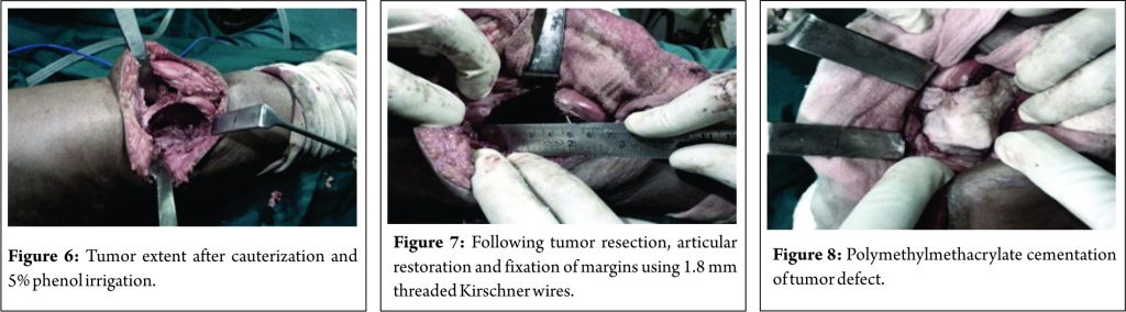 Under spinal anesthesia, with tourniquet, an anterolateral parapatellar approach was taken, with view of future need of knee arthroplasty. After adequate visualisation of tumor extent and articular margin, marking was done for wide resection (Fig. 5&6). Surgical mops were placed before opening the marrow, to avoid surrounding tissue contamination. Cortical breakout of lateral femoral wall occurred midway and curettage was done till the extent of viable bleeding bone. Cauterization of margins was carried out followed by denaturation of margins using 5 % Phenol soaked mop(Figure 6&7). Articular margin of lateral knee joint was reconstructed after elevation of subchondral bone and fixation using 1.8 mm threaded K wires (Fig. 8).
