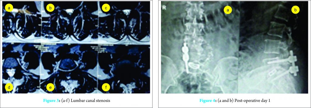 he screws were inserted now on the left pedicle of L4 and S1. Another screw was placed in the right pedicle of L4, and a longer rod was placed (Fig. 8). The patient was discharged after suture removal on the 14th post-operative day. The patient was relatively pain-free and ambulating at the time of discharge. During the subsequent follow-up at 6 months, the patient has shown significant symptomatic improvement and has resumed her routine daily activities.