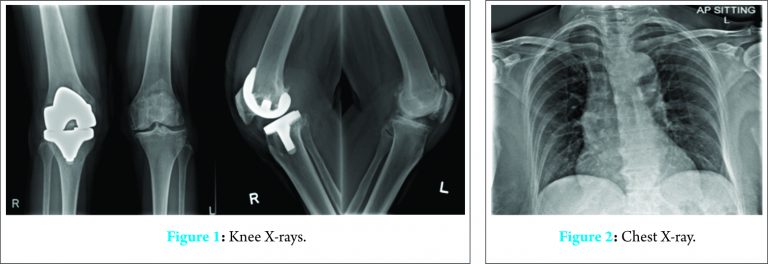 Inflammatory markers were markedly raised with C-reactive protein (CRP) 333 mg/L, white cell count 16.26 × 109/L and erythrocyte sedimentation rate 84 mm/h. Other blood tests were within normal range. Her right knee X-ray showed no features of prosthesis loosening or periprosthetic fractures (Fig. 1). Chest X-ray showed no evidence of consolidation in the lungs (Fig. 2).