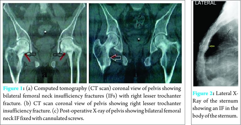 A 50-year-old male with chronic kidney disease presented with pain both hips region for past 1 year and inability to walk without support for past 6 months. The pain was severe in intensity and got aggravated on walking. There were no constitutional symptoms, no night pain, or history of any trauma. On investigations, there were deficient levels of serum Vitamin D levels (<3 ng/dl), raised parathyroid hormone (PTH) (1400 mg/dl), and elevated alkaline phosphatase levels (980 units/L). X-ray was suggestive of IF in both femoral necks. Further, computed tomography (CT) scan confirmed the existence of bilateral femoral neck fractures and another fracture in the right lesser trochanter (Fig. 1a and b). He was managed with fixation of both femoral necks with multiple cannulated cancellous screws (Fig. 1c).