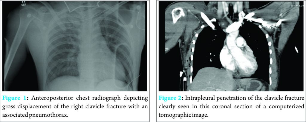 Case Report: A 22-year-old intoxicated male with no past medical history was admitted to the trauma bay in stable condition after being involved in a motor vehicle accident. On the primary survey, the patient was noted to be tachypneic with decreased breath sounds over his right hemithorax. Radiographic studies of his chest demonstrated a right proximal third clavicle fracture with inferior displacement with associated partial pneumothorax; the patient was also noted to have a right femoral shaft fracture. Neurovascular examinations of his extremities were normal. A chest thoracostomy tube was inserted and placed under suction. Computerized tomography studies later revealed that the fractured clavicle had penetrated the pleura and caused the partial lung collapse. The patient was initially placed in a sling and underwent intramedullary nailing of his femur on the day of presentation. Given the severe displacement of his clavicle fracture into the lung tissue resulting in pneumothorax, there was significant concern for nonunion and lack of resolution of the pneumothorax. 2 days after stabilization of his right femur fracture, the patient underwent open reduction with internal fixation of his right clavicle. Follow-up radiographs showed a healed clavicle fracture and resolved pneumothorax.