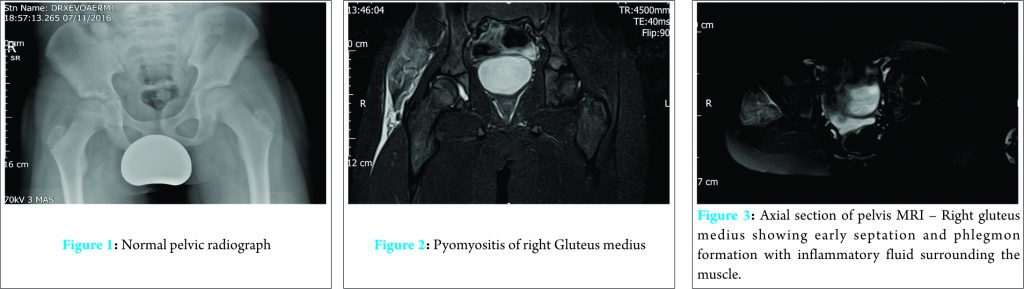 Case report: We present a case of 12 year old boy presented with right hip pain, fever and antalgic gait. Inflammatory markers were raised at presentation. The pelvic radiograph and ultra sound scan of right hip joint did not detect any abnormality. The Magnetic Resonance Imaging (MRI) scans revealed inflammatory oedema in the right gluteus medius muscle. He was treated with intravenous Flucloxacillin for 10 days and later 6 weeks of oral Flucloxacillin. At the 6 weeks follow up patient was asymptomatic with normal gait. MRI at 6 weeks did not show any fluid collection in gluteus medius.