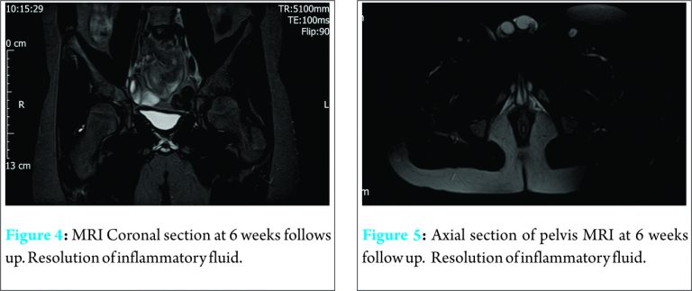 At 2 weeks, his hip pain had fully resolved, and he demonstrated a full range of painless active hip movement, although he continued to use crutches when walking. There was no tenderness over the gluteal or trochanteric region. At 4 weeks, he was permitted full weight bearing without any support. His CRP was < 3 mg/L. A repeat MRI scan at 6 weeks showed no evidence of any oedema or fluid collection in and around right gluteus musculature ( Figs 4 and 5).
