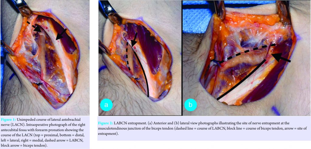 Case Report: A 27-year-old left-hand dominant male presented to our orthopedic elbow clinic complaining of bilateral elbow clicking and discomfort which had been present for several years. His painful symptoms were localized to the anterior aspect of both elbows and had slowly become more painful despite simple analgesia and physiotherapy. Examination revealed the full range of movement of both elbows with no instability or weakness. Plain imaging and magnetic resonance imaging scans of both elbows did not reveal any pathology, and the decision was made to explore the right elbow, as this was the most symptomatic. Under general anesthesia with tourniquet an anterior curvilinear antecubital fossa incision was made. The lateral border of the distal biceps tendon showed evidence of compression of the LACN at the musculotendinous junction. The tendon was partially resected, and the nerve confirmed to move freely without further entrapment. At 4 weeks after surgery, he was completely asymptomatic. The patient was later listed to undergo a similar procedure to the left side; however, he could not go ahead with surgery so far due to work commitment.