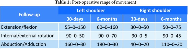 As the patients recovering progressed, a magnetic resonance imaging (MRI) scan of the right shoulder was performed 3-day post-injury to clarify the soft-tissue damage and subsequently a single-row rotator cuff repair using two 5.5 mm TwinFix® anchors (Smith & Nephew; London, United Kingdom) was performed. An additional Pulley-lesion was treated with a biceps tenodesis with fixation of the tendon to the intertubercular sulcus using a 5.5 mm Footprint® anchor (Smith & Nephew; London, United Kingdom). The Hill–Sachs lesion was insignificant and did not require any further treatment (Fig. 2c). Post-operatively, the left shoulder was immobilized in a Velpeau-sling for 4 weeks and the right shoulder in an abduction splint for 6 weeks. Passive mobilization of both shoulders was started immediately on the first post-operative day, followed by increasing active and assistive mobilization. On the right shoulder, progressive adduction and a steady build-up of strength were initiated after 6 weeks. On the left shoulder, full mobilization was allowed following clinical and radiological confirmation of fracture consolidation. Physiotherapy (3 times a week), aquatic therapy (2 times a week), and a 3-week stay in a rehabilitation facility 2-month post-injury completed the post-operative care. The patient was discharged in good general condition with a total inpatient stay of 11 days. The 30-day follow-up assessment showed a still restricted range of movement while the 6-month follow-up assessment demonstrated bilateral considerably improved range of movement (Table 1). At the 2-year follow-up assessment still no evidence of implant failure, recurrence of dislocation or instability was observed.