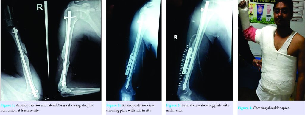 Case Report: We report a case of a young adult male who sustained a compound fracture of humerus shaft treated with intramedullary nailing followed by subsequent bone grafting and eventually landed up in non-union and was treated at our center by locking compression plate application with nail in situ with iliac crest autogenous bone graft followed by shoulder spica application.