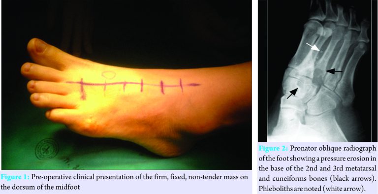 A SCH of the bone is rare to occur in the midfoot area. Wide resection of the bone and soft tissue surrounding is necessary. A curve autologous iliac bone grafting with soft tissue reconstruction can be challenging. Stability and foot function are also need to be concerned.