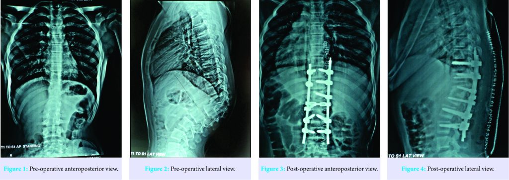 A 17-year-old male patient presented with progressive spinal deformity. He had difficulty in lying down on the back due to the hump. The deformity was noted since childhood and was progressing gradually. The rest of the history was unremarkable. On physical examination, the patient had severe kyphosis with apex at thoracolumbar junction. His anthropometric measurements were noted, which include, body weight-50 kg, standing height-160 cm, sitting height-80 cm, and arm span-166 cm. Body mass index (BMI) was 19.56, which was 33 percentile of age- and sex-matched controls. The patient had no limb length discrepancy and neurologically intact. Kyphotic angle as measured by Cobb’s method was 80° (Fig. 1 and 2).