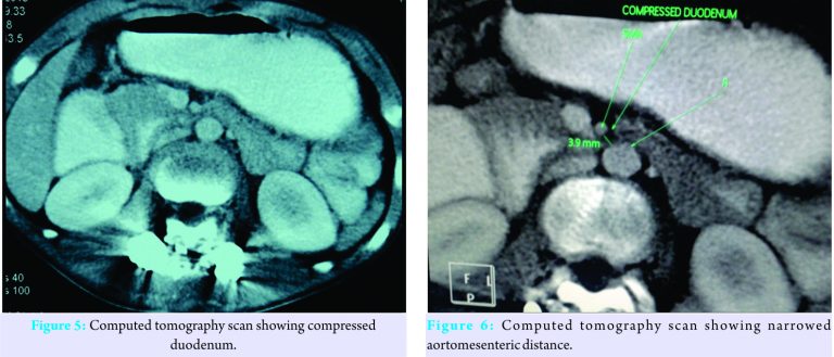 Superior mesenteric artery syndrome is a rare complication after spine deformity correction. This syndrome was first described by von Rokitansky in 1842 [1] and termed to as “superior mesenteric artery syndrome” by Wilkie. This vascular obstruction of the third part of duodenum by superior mesenteric artery leading to gastric outlet obstruction is known as superior mesenteric artery syndrome. Obstruction of the small bowel by superior mesenteric artery is associated with spinal manipulation in conservative or surgical management of scoliosis, in extensive burns, major surgeries, severe trauma, malignancies, and following application of spica casts. The incidence of superior mesenteric artery syndrome is 1–4.7% [2,3]. This syndrome presents with pain, immediate postprandial bilious vomiting, and abdominal bloating. Signs of superior mesenteric artery syndrome develop 5–10 days after spine deformity correcting procedure. Secondary complications include poor wound healing secondary to poor nutrition, delayed recovery. The syndrome may progress to serious sequelae with mortality rate of 33% [4]. This is common in patients with low body weight relative to height [5]. Malnourished patients experiencing increase in height after surgery relative to weight after surgery are more susceptible to this.