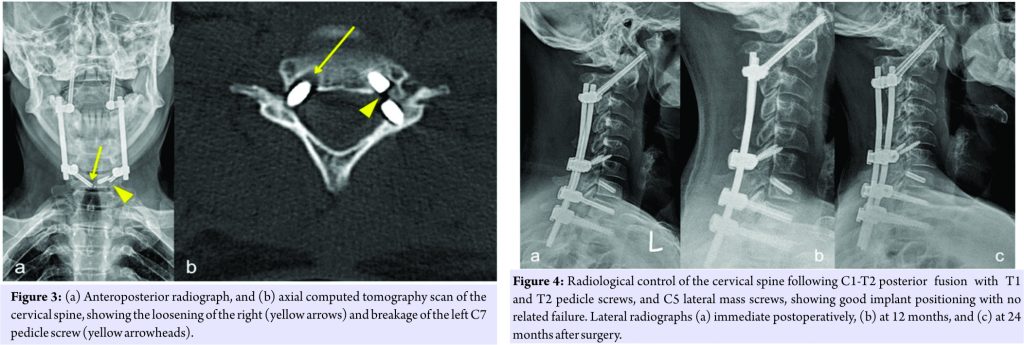 Surgical management was deemed necessary for reversing the patient’s incipient myelopathic symptoms or at least for preventing them from deteriorating. During the preoperative planning, serious doubts existed with respect to the bone healing properties of the patient, and considerations were made regarding whether a revision surgery would be necessary in the future. This led us to the decision, to perform posterior decompression and fixation, with the minimum instrumentation possible, nonetheless, in order to preserve sufficient bone stock. Under a rather difficult and challenging general anaesthesia, the patient underwent posterior decompression with C2-C3 laminectomies, and C4-C6 hemilaminectomies. Intraoperatively, a gluey soft tissue thickening covering the spinal cord was discovered; this tissue formation was strongly adherent to the dura and its complete resection was not feasible, due to great risk of dural tear. We noticed also a hypertrophic ligamentum flavum, which was rather underestimated in the MR imaging. A posterior C1-C7 fixation was performed with C1/2 transarticular and C7 pedicle screws (Neon™, Ulrich Medical, Ulm, Germany), under navigation (Brainlab AG, Munich, Germany). At Day-2 after surgery, the patient was ambulatory and pain free, with mild paraesthesias remaining over the feet. He was discharged home five days later, and was strongly advised to return gradually to his athletic activities (at least after 3 months). Owing to his great improvement though, the patient returned to sports rather sooner than advised (4-6 weeks), and six months after surgery a relapse of severe neck pain occurred. Plain radiographs showed that both C7 pedicle screws had failed; a cut-out of the right and breakage of the left screw had occurred (Fig. 3). The patient was readmitted and a reoperation was scheduled. The initial instrumentation was revised and extended to a C1-T2 posterior fusion, with screws at C1/2, C5, T1 and T2 levels (Fig. 4).