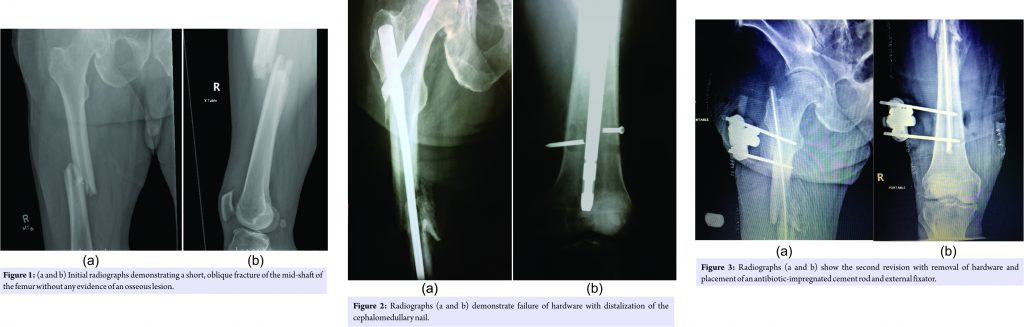 Conclusion: We report a rare case of femoral osteomyelitis presenting as a pathologic fracture. Treatment involves multiple surgeries and an extended recovery.