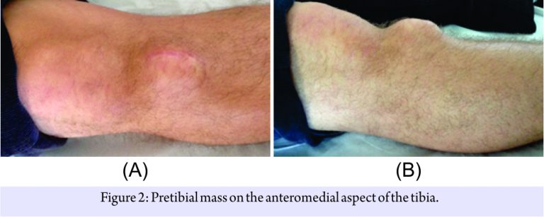 In November 2014, an open excisional biopsy and primary closure surgery were performed at a different medical center. The material was sent to a pathology laboratory and resulted in a “ganglion cyst.” 2 months after surgery, a painful mass recurred over the anteromedial proximal tibia measuring approximately 10 mm × 25 mm. A gelatinous substance was suctioned from the mass, in a sterile environment, consistent with a recurrent ganglion cyst. 40 days following this event, the cyst had reappeared and measured approximately 50 mm × 40 mm (Fig. 2). At that time, the patient was referred to our hospital.
