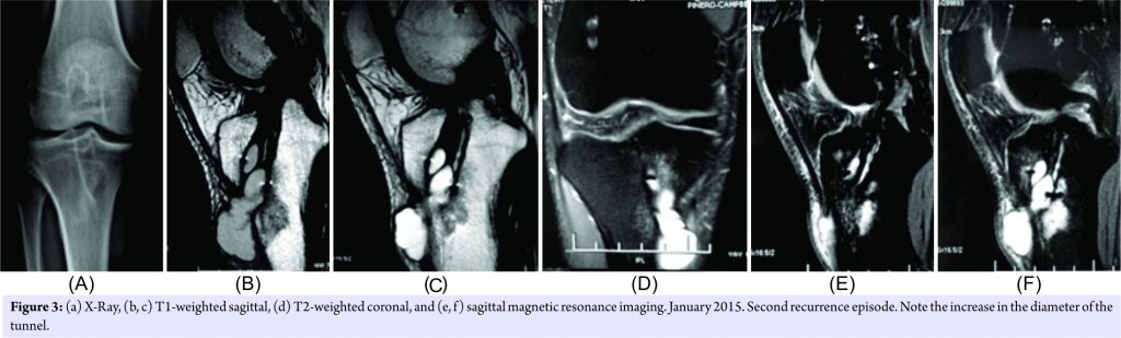 The patient remained asymptomatic for 3 months, but when he returned to sport activities, a painful palpable mass was evident again in the same site. Like previous episodes, no clinical or laboratory parameters of infection were found. The X-ray and MRI revealed a new cyst recurrence, with an increase in the tunnel size compared to the previous episode.
