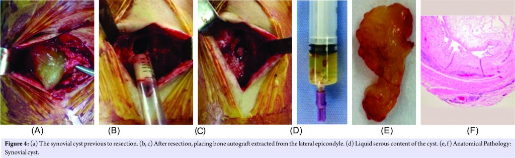 Conclusion: Initial surgical resection might have failed due to insufficient surgical treatment. In case of suspicion of articular communication, we consider that the correct treatment is the resection of the cyst, proper curettage of the tunnel walls and a thorough filling of the space with bone graft. This course of treatment may avoid a recurrence.