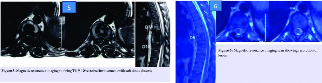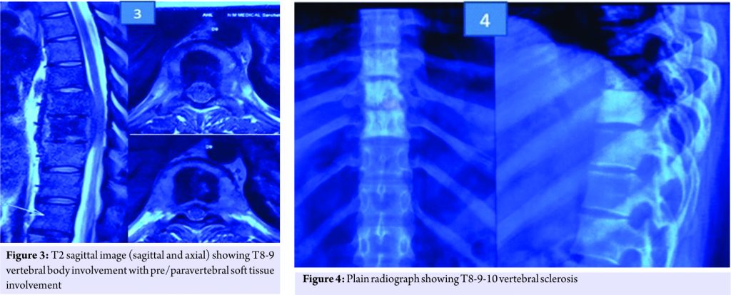 We did plain radiograph (Fig. 4) which showed thoracic 8-9-10 sclerosis, which had progressed as compared to the previous radiograph. MRI scan (Fig. 5) showed T8-9-10 involvement with soft tissue component similar to last scan. Laboratory investigations showed erythrocyte sedimentation rate-45, C-reactive protein positive, and white blood cell counts were normal.