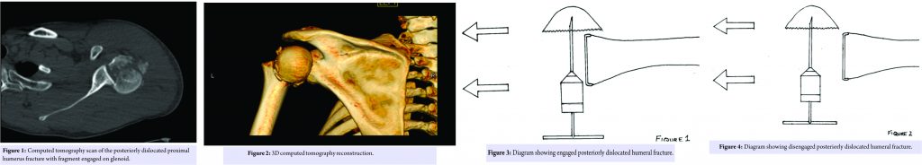 Technical Tip: Posteriorly dislocated humeral fracture is approached through deltopectoral approach. Schanz pin is inserted into the humeral head to achieve purchase in the humeral head. Applying laterally directed force the humeral head is disengaged from the lateral margin of glenoid. A rotatory force then repositions the humeral head into a congruous position. Open reduction internal fixation is then carried out in a standard fashion.