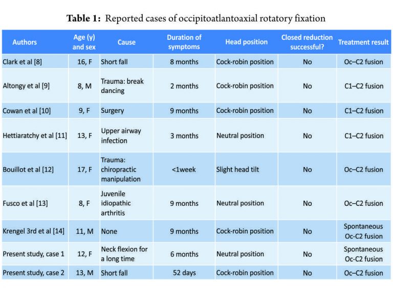 As a result of treatment with remodeling therapy for chronic AARF, we encountered 2 cases of irreducible AARF. In case 1, chronic AARF could not be reduced, and the disorder progressed to spontaneous fusion of the Oc–C1–C2 complex. In case 2, although symptom duration was <3 months, AARF with both rotatory subluxation and progressive facet deformity of Oc–C1 joint could not be reduced. We first describe pathological changes in the Oc–C1 joint with rotatory subluxation in patients with chronic AARF. To the best of our knowledge, there are only 7 previous reports of OAARF [8,9,10,11,12,13,14] (Table 1).