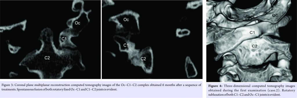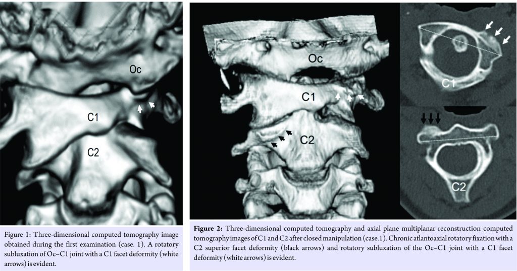 Atlantoaxial rotatory fixation (AARF) is a rotatory dislocation or subluxation of the atlantoaxial (C1–C2) joint in children [1]. In general, acute AARF resolves either spontaneously or by conservative treatment [1,2]. However, sometimes AARF is resistant to conservative treatment if the definitive diagnosis is delayed and acute AARF becomes chronic [3,4,5,6]. Ishii et al. observed the morphometry of C1–C2 joint using three-dimensional computed tomography (3D CT) imaging in patients with chronic AARF [7]. Deformity of the superior facet of the axis (C2) and >20° of lateral inclination of the atlas observed on 3D CT are known factors in the progression to intractable AARF [7]. Occipito AARF (OAARF) is thought to be an extremely rare and intractable condition involving fixed rotational subluxation of the atlas (C1) for both the occipital bone (Oc) and C2; there are only 7 reports about cases of OAARF in the literature [8,9,10,11,12,13,14]. However, there is a possibility that disorders of the atlanto-occipital (Oc–C1) joint in patients with AARF are neglected. Using conventional CT images, Ono et al. have already pointed out that the compensatory rotation of Oc for C1 and hypermobility between Oc and C1 may develop in chronic AARF [3]. Pang and Li reported significantly increased rotation of Oc on C1 in chronic AARF [6]. They suggest that most of the compensatory alteration in Oc–C1 laxity takes place sometime after prolonged C1–C2 fixation for 3 months [6]. Until now, disorders in the Oc–C1 joint in chronic AARF have not been fully elucidated because disorders in the craniocervical lesion are difficult to evaluate with plain radiographs, conventional CT, and magnetic resonance imaging. There are no reports to investigate the morphology of Oc–C1 joint with rotatory subluxation in detail. In the present report, we first describe two rare cases of chronic AARF with rotatory subluxation and secondary facet deformities in Oc–C1 joint.