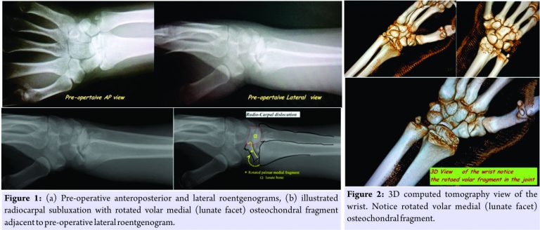 Conclusion: Overlooking of palmar rotated osteochondral fragment will cause deficiency to build proper pre-operative strategy to approach the reduction of the fragment. The incompetence of reduction will deteriorate the articular surface and lead to early osteoarthritis of the wrist. The surgeon should detect this fragment and should be familiar with volar approaches of the wrist. Above average surgical experience would be needed for successful reduction.