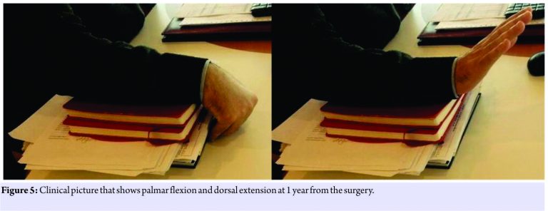 After 5 weeks postoperatively, the external fixator removed, physical treatment started. The post-operative 4-month X-rays revealed that the volar fragment united with good alignment. However, dorsal half of the joint healed a little irregular (Fig. 4). The patient achieved 60–70° of palmar flexion and 60–65° of dorsiflexion (Fig. 5) and returned to daily activities without any discomfort and pain after 1 year from the surgery. In last telephone call (after 18 months from the surgery), he stated that he was satisfied with clinical results.