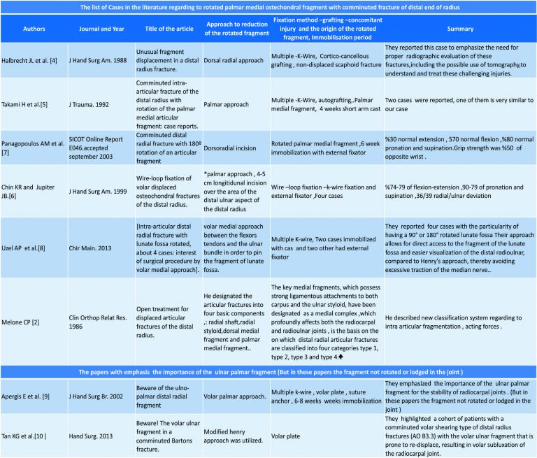 Intra-articular fractures of the distal radius are more challenging to treat than extraarticular fractures [1]. Displaced fractures of the articular surface of the distal radius have a worse prognosis than extraarticular fractures because of potential for incongruity and arthrosis of radiocarpal and distal radioulnar joints, carpal subluxation and associated intercarpal ligament injuries [1]. Intra-articular distal radius fractures have long been massively discussed in the literature, but regarding to fractures that possess rotated palmar medial fragment a few amount paper has been written [2,3,4,5,6,7,8,9,10] (Table 1). In this article, we would like to emphasize the significance of the palmar medial rotated osteocartilaginous fragment.