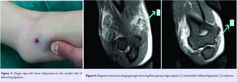 Elbow joint anatomically consists of radiohumeral, ulnohumeral, and proximal radioulnar joints. Its passive stabilizators are joint capsule and ligaments among medial collateral ligament (MCL) and lateral collateral ligament (LCL). Its active stabilizators are muscular groups that have connections as periarticular origins and insertions. Elbow is the second most dislocated joint in adults. Elbow periarticular fractures are coexisted with 1/5 of the patients [1]. For simple dislocations, closed reduction and conservative treatment are adequate. When olecranon, coronoid process, radial head fracture, and LCL rupture accompany, it is defined as complex dislocation. Open reduction and internal fixation and ligament repairing are required for the treatment [2]. For seldom cases, MCL repairing or external fixation should be done. For this case, instable elbow dislocation without fracture was present. Surgical treatment was decided because of detecting flexor group origo rupture (FGOR) that accompanies MCL rupture (MCLR) through magnetic resonance imaging (MRI) examination, which had not been reported until now.