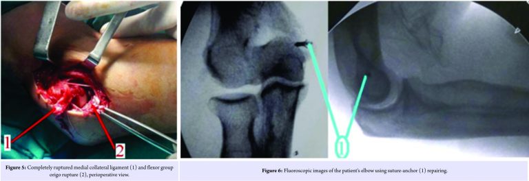 Case Report: A 30-year-old man came to emergency department after falling on the outstretched palm. After first physical examination and radiologic searches, elbow joint posterolateral dislocation was diagnosed. Together with sedoanalgesia, elbow dislocation was reduced, and instability evaluation by applying varus and valgus stress tests was performed. Positive valgus stress test and palpation sign which indicated soft tissue damage on the medial side of elbow were determined. Control roentgenograms showed no osseous pathology. By magnetic resonance imaging, elbow dislocation diagnosis accompanying MCLR and FGOR without fracture was confirmed. Using medial approach, ruptured MCL and elbow FGO repairing procedures were performed.