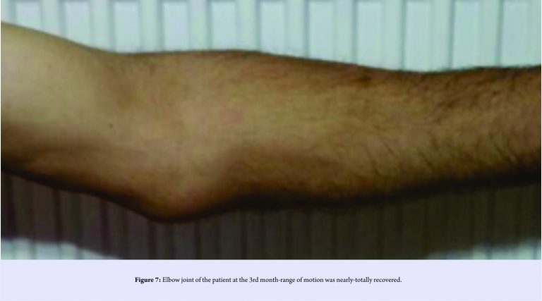 Ulnar nerve was preserved and protected during the operation. MCL was observed completely (containing both A-P bundles) ruptured, and repaired by suture-anchor implant (Fig. 6).FGO was seen completely ruptured and repaired by drilling holes to the bone and transosseous-passing sutures. Long arm splint was applied about 2weeks. After immobilization, appropriate rehabilitation program including passive motion was done using angle-adjustable armrest about 3 weeks. Active motion was begun at the 5th week. No complication was observed during follow-ups (Fig. 7).