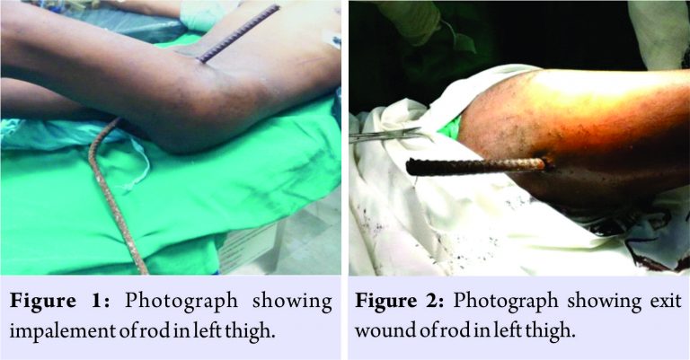 An 18-year-old male fell from a height of 15 feet at construction site over rusted iron rod which penetrated through his left upper thigh. The rod was cut with a saw to facilitate transport to hospital. On presentation, he was conscious, well oriented, and hemodynamically stable (GCS-E4M6V5). The patient didnot have any other major injury except abrasions over left forearm,elbow, and left lower back. Entry wound of the rod was through the posteromedial aspect of the left upper thigh, with an exit through anterolateral aspect of thigh(Fig. 1 and 2).