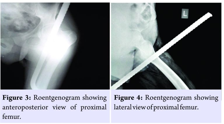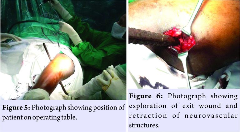 Patient’s distal pulsations were well felt. No attempts were made to remove the rod in the procedure room. PlainX-rays of thigh confirmed trajectory of rod(Fig. 3 and 4). Complete hemogram, arterial blood gas analysis, and serum electrolytes were all within normal limits. The patient was taken in the operation theaterkeeping a team of vascular and plastic surgeons stand by. General anesthesia was administered in right lateral position (Fig. 5). The exit wound of the rodwas extendedand soft tissue dissection was carried out to make the rod free from the adjacent neurovascular structures (Fig. 6). We found that rod had penetrated vastus medialis and sartorius muscle through substance, femoral and profundal vessels were just medial to it. We checked for any breach in vessel lumen and inspected nerves carefully by exploring them proximally and distally. Neurovascular structures were found to be intact. In deeper dissection, rodwas found between adductor group of muscles on one side and femoral bone on another. Once we were sure of integrity of neurovascular structures, the protruding part of the rod was gently pulled posteriorly along its length through wound track, with continuous monitoring of the distal pulsations.