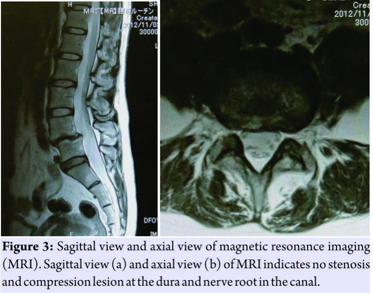 Magnetic resonance imaging revealed no compression and stenotic lesion in the canal or fibrocartilaginous mass (Fig.3). Considering a diagnosis of left L4 radiculopathy because of the free ossification in the foramen at L4–L5, selective nerve root block was performed, and it was very effective temporally. However, because her leg pain occurred repeatedly, operative treatment was planned over 7 months after the initial visit to our hospital.