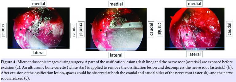 For this ossification lesion, some surgical options could be considered [1,2,3,4,5,6]. In general, posterior fusion approaches, such as posterolateral fusion surgery and transforaminal lumbar interbody fusion, are selected [4]. However, these methods were considered invasive and problematic, with the possible occurrence of adjacent segment disease in the future because the patient was relatively young. Only decompression of the nerve root and open surgery through the Wiltse approach was considered [5], but entire foraminal space and the whole ossification lesion were never invisible with this means, unless almost all parts of the posterior supporting structures of the spine, such as the facet joint and pars interarticular is, were resected. Spinal canal enlargement using restorative laminoplasty is a non-fusion surgical approach and had the advantage of visibility in the foramen, but this approach is more invasive than our approach and includes a complicated procedure[1]. Nerve root decompression without instrumented fusion, i.e., Gill’s procedure[2], was not chosen because progression of anterior slip or instability could occur. Our microendoscopic method had two major advantages. One was the ease to reach the nerve foramen and ossification lesion. The reason for this was that spinal microendoscopy provides an overview of the intra foramen from the outside using the property of its 25° oblique view, without resection of the pars interarticularis and facet joint[6]. The other was the non-invasiveness at the posterior supporting structures of the spine. Therefore, we believed that our approach was the most ideal option to surgically treat our patient. Some studies have reported on the use of an ultrasonic bone curette in spinal surgery [7,8,9]. Although minor complications of dural tears with the use of this device have been reported [8], its use is safe in spinal surgery, with a very low complication rate [7,9], and it is effective with a trend of reduced blood loss[7]. Some reports stated that this device was efficient during foraminotomy, cervical and thoracic corpectomies, and revision spinal surgery [7,9]. However, there has been no report on its application in microendoscopic spinal surgery. Because the tip of this device was developed to be bent moderately(Fig.6), it is easy to use under a microendoscope with the property of its 25° oblique view. We emphasize that the use of an ultrasonic bone curette in microendoscopic spinal surgery could allow the effective, less invasive, and safe removal of an intraforaminal bony lesion, without the occurrence of allodynia associated with injury to the DRG [10].