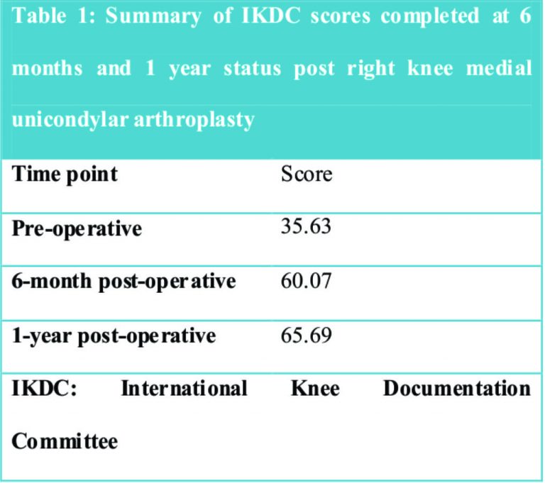 The knee was put through a full range of motion and examined for stability as well joint space opening with valgus stress. The ACL, PCL, LCL, and MCL were found to be intact without instability. The lateral and patellofemoral compartments were examined and confirmed to be without significant degeneration. At this time, it was determined appropriate to proceed with the unicondylar knee arthroplasty instead of a total knee arthroplasty. Bone resection was completed on the femur and the tibia, and then, the trial components were placed with good stability. The patella tendon continued to subluxlaterally at approximately 80° of flexion, but no correction was performed as discussed with the patient preoperatively. The trial components were removed and the bony surfaces were copiously irrigated with pulse lavage. The appropriate components (size 3 femur, size 3 tibia, and 8mm polyethylene liner) were cemented (non-antibiotic loaded) into position beginning with the femur, then the tibia, and finally, insertion of the polyethylene after removal of excess cement. The knee was held in extension while the cement was allowed to harden. The final alignment was evaluated to be in neutral alignment with appropriate varus/valgus stability. No intraoperative pain cocktail or long-acting analgesic was utilized. A single ConstaVac drain was placed. The arthrotomy was closed, with the knee in approximately 30° of flexion, w+++++++++++++++++++ith figure-of-eight 0 Vicryl sutures. The skin was closed deeply with absorbable suture followed by running Monocryl stitch and Dermabond tape. A sterile compressive dressing was placed and the patient was taken to recovery after having tolerated the procedure without complication. Following the procedure, the patient was discharged with a home physical therapy program that focused on motion and muscle strengthening on post-operative day 1. Patient received 3 doses of IV antibiotics post-operatively, and the drain was removed prior to discharge. Post-operative pain control was managed with a 2-week course of narcotics. No post-operative antibiotics or deep vein thrombosis prophylaxis were prescribed. Upon her first post-operative visit at 2 weeks, the wounds were clean and dry without any evidence of wound dehiscence or infection. At her 5-week follow-up, the patient returned to the clinic with complete resolution of her pain. On examination, she had no medial joint line tenderness and range of motion from 0 to 120°. Radiographs of the right knee showed excellent alignment of medial components with restored medial joint space. Varus deformity was corrected to 1 degree of residual varus (Fig. 3). The patient returned at3months status post right knee medial unicondylar arthroplasty with significant improvement. On examination, she had no pain and symmetric knee range of motion, 0–140° bilaterally. She continued to have patellar tendon subluxation laterally at approximately 80° of flexion, stable from pre-operative evaluation. At 6months and 1year status post-surgery, the patient filled out an online version of the IKDC Subjective Knee Evaluation Form with stepwise improvement at each time point (Table 1).
