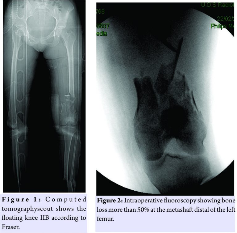 With modernization and advances in motorized technology, the pattern and problems associated with trauma are also changing [1]. Road traffic accident accounts for majority of the cases and this was followed by fall from height. The word floating knee was introduced for the first time by McBryde in 1965 as reported by Nouraei et al.[1]. This injury is defined as a flail knee joint resulting from fractures of the shafts or adjacent metaphyses of the femur and ipsilateral tibia (see image below). Floating knee injuries may include a combination of diaphyseal shaft, metaphyseal, and intra-articular fractures [2].Besides, being caused by high-energy trauma with extensive skeletal and soft tissue damage, they are also associated with potentially life-threatening injuries of the head, chest, and abdomen [3]. The floating knee is a complex injury with more than just ipsilateral fractures of the femur and tibia. The prognostic indicators of the initial and final outcome in patients include injuries and the type of fracture (open, intra-articular, and comminution)[4]. Some other complications attributable to floating knee injuries include infection, excessive blood loss, fat embolism, malunion, delayed or nonunion, knee stiffness, prolonged hospitalization, and inability to bear weight[3]. Fractures of the distal part of the femur account for 7% of all femoral fractures [5]. Supracondylar fractures of the femur with bone defect/loss are a challenge for orthopedic surgeons to treat. Bone loss and open fracture are complex injuries that are difficult to manage; despite advances in technique and improved implants, treatment remains a challenge in many situations [5]. The autologous bone reimplant properly treated and the use of bone sticks, derivation of stem cells from the bone marrow and platelet-rich plasma (PRP) is a practice in traumatology used for some years opposed to the metal for the synthesis treats serious bone loss. The purpose of this case report is to report on the proper damage control definitive treatment of bone loss in the treatment of femoral bone loss of a polytrauma affection even knee floating Fraser IIB with double exposure Grade III B of the femoral and tibial shaft.