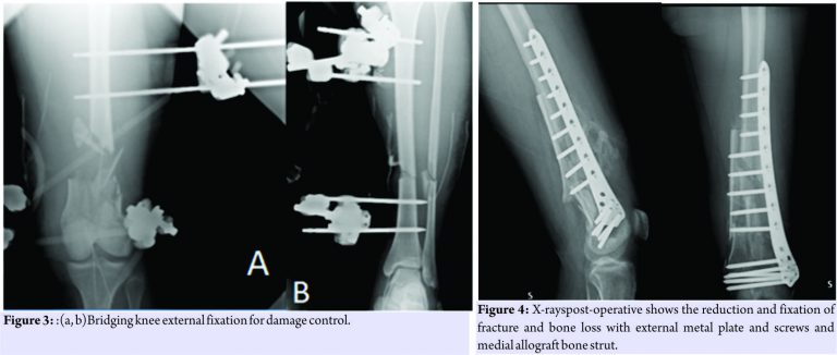 Case Report: The patient was treated with an external fixator femorotibial bridge after extensive cleaning and debridement of open fractures. After 17-day post-trauma, we substitute the fixator with a less invasive stabilization system plate and screws with contralateral allograft bone strut.3months after the first surgery, the patient underwent surgery for the intramedullary nailing of the tibia. The follow-up was clinical using the knee injury and osteoarthritis outcome score (KOOS), short form 12 health survey (SF-12) for the quality of life, and radiological at 1–3–6–12–18–24–36 months. The patient walked with partial load up until the 6months after injury and then began a progression to a total load. At 24-months post surgery, the patient had both the KOOS and SF-12 at 100 points.