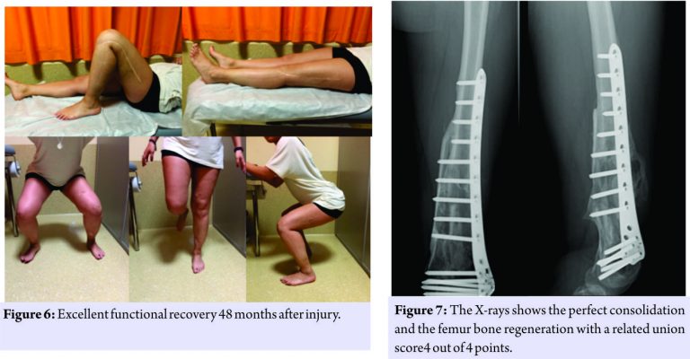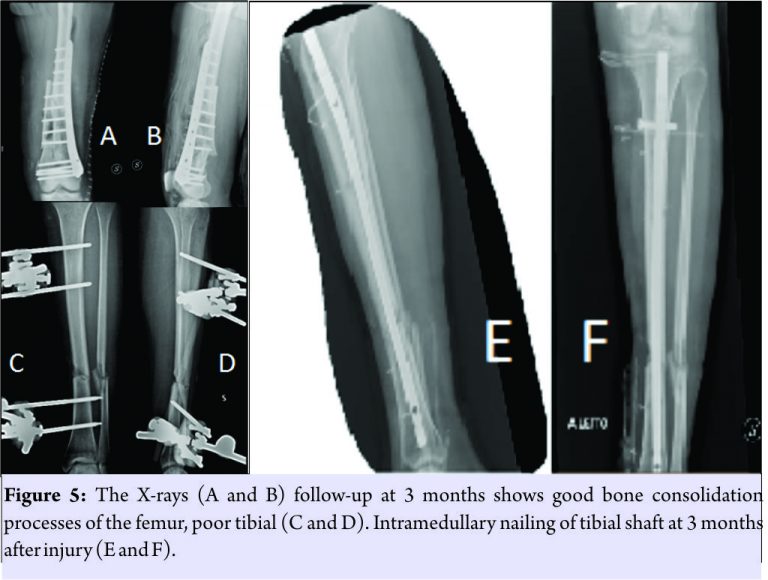 The patient was not treated surgically for the fissure of the spleen, and the resolution of the neurological picture took place after 6 days. The patient was submitted to a specific antibiotic therapy according to the protocol for the open fractures and was monitored with clinical and laboratory examinations. The 21stday post-trauma, without any clinical or laboratory signs, the patient was operated on with a less invasive stabilization system plate and screws, cortical and cancellous bone grafting allogeneic bank, and autologous stem cells taken from the iliac crest, PRP rich in leukocytes and replanting of native bone. The surgical access chosen was the lateral subvastus to preserve the perforating arteries(Fig.4). The patient was monitored with 15 days clinical follow-up, laboratory, and radiological at 1 month, 2 months, 3 months, 6 months, 12 months, 18 months, 24 months, 36 months, and 48 months. The indices used to evaluate the outcomes of this intervention were the knee injury and osteoarthritis outcome score (KOOS), the related union scorefemur (R.U.S.F.) for the femoral bone healing, and the score radiographic union score for tibial fractures (R.U.S.T.). For bone consolidation of shank, the short form 12 health survey (SF-12) for the quality of life, and the number of complications and re-operations. The patient in the immediate post-operative made active and passive mobilization of the knee until the 3rdmonth, reaching a flexion of 90°. The patient was subjected to the intervention of removal of the external fixator and intramedullary nailing of the tibia 3 months after the first surgery(Fig. 5)