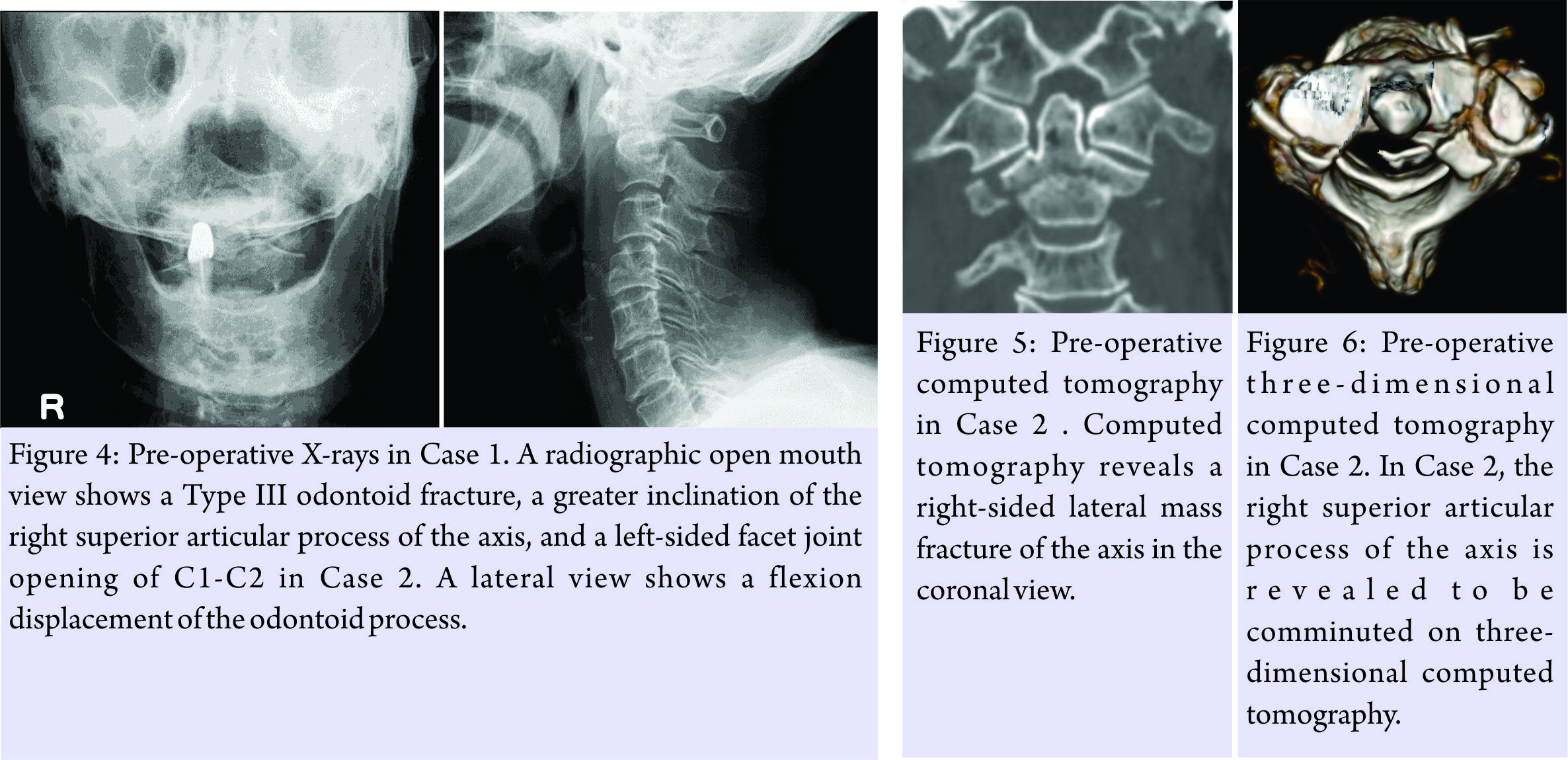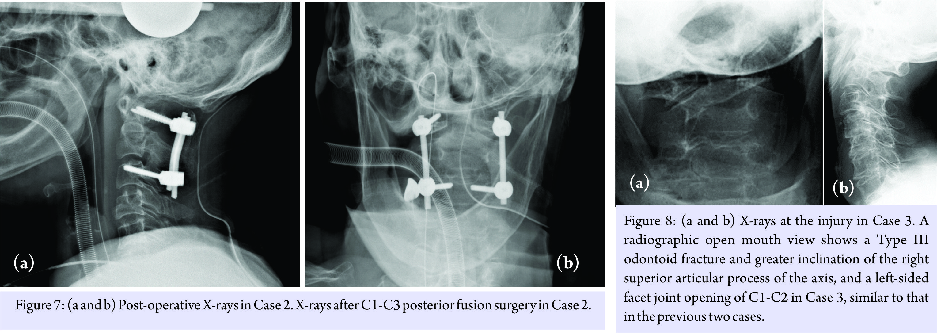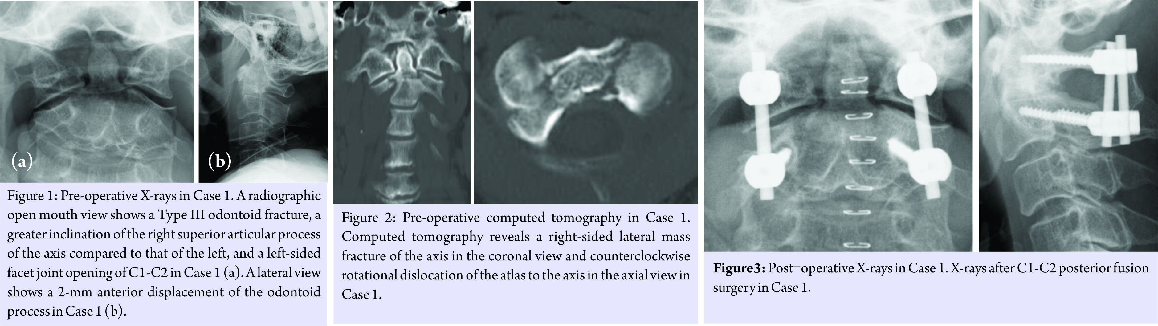 Conclusion: Of importance, the combined fractures shown in the current study may be considered as Type III odontoid fractures when diagnosed only by X-rays. Therefore, when observing a great dislocation, the presence of comminuted fractures or torticollis of the odontoid should be ascertained on X-ray and computed tomography images (especially coronal images). To avoid lingering symptoms in the neck, surgery is recommended for the treatment of these fractures.