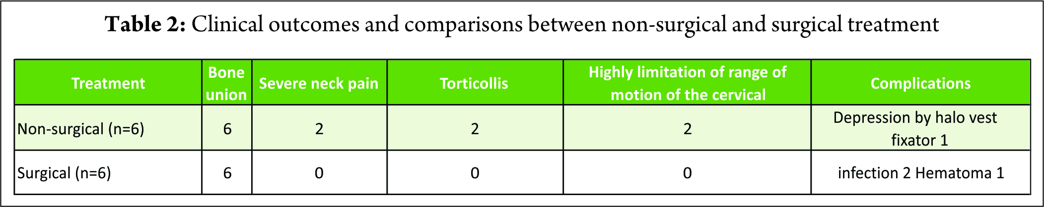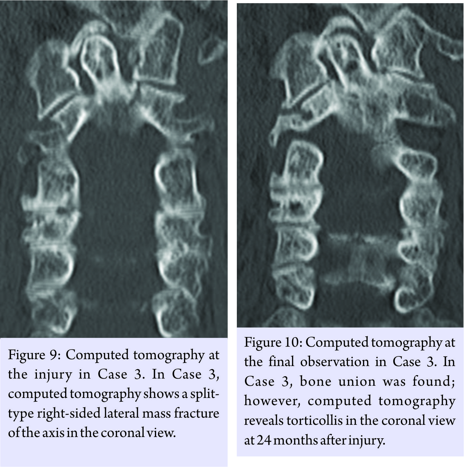 A comparative study of the clinical outcomes for conservative and surgical treatment of these fractures was performed using previously reported cases (Table 1) in addition to the present cases. In 12 cases, including the present three cases, the clinical outcomes were well disclosed. Of these cases, six were treated surgically, and six were treated non-surgically. Non-surgical cases tended to possess stronger neck pain, a higher frequency of torticollis, and larger limitations in the ROM of the neck after treatment compared to that in surgical cases (Table 2).