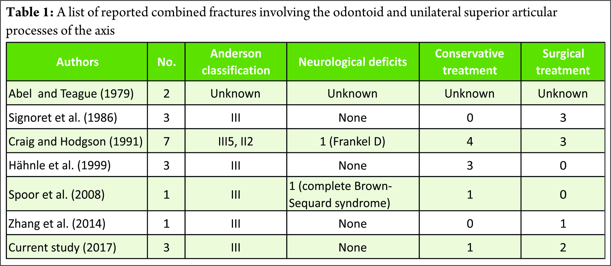 Combined fractures involving the odontoid and unilateral superior articular processes of the axis are rare, and a treatment strategy has not yet been established. To our knowledge, only 17 such cases have been reported [1, 2, 3, 4, 5, 6]. Herein, we report three cases of combined fractures involving the odontoid and unilateral superior articular processes of the axis, with a literature review. In addition, we provide novel information regarding the mechanism of injury and fracture forms, and propose treatment strategies for such uncommon fractures.