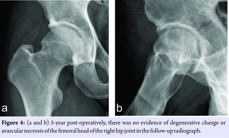 Histologic study revealed characteristic findings of Milgram Stage II synovial osteochondromatosis. The patient has been followed up for 5 years. Subjectively, he has no complaint and full motion of the operated hip joint. Harris hip score improved from pre-operative 60–94 points at the time of the latest follow-up. He plays volleyball and softball regularly without any problem. The latest follow-up X-rays showed clear a right hip joint without evidence of osteoarthritis or avascular necrosis of the femoral head (Fig. 4).