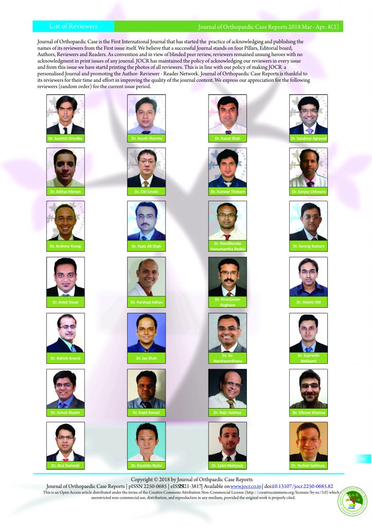 Journal of Orthopaedic Case is the First International Journal that has started the practice of acknowledging and publishing the names of its reviewers from the First issue itself. We believe that a successful Journal stands on four Pillars, Editorial board, Authors, Reviewers and Readers. As convention and in view of blinded peer review, reviewers remained unsung heroes with no acknowledgement in print issues of any journal. JOCR has maintained the policy of acknowledging our reviewers in every issue and from this issue we have started printing the photos of all reviewers. This is in line with our policy of making JOCR a personalised Journal and promoting the Author- Reviewer – Reader Network. Journal of Orthopaedic Case Reports is thankful to its reviewers for their time and effort in improving the quality of the journal content. We express our appreciation for the following reviewers (random order) for the current issue period.