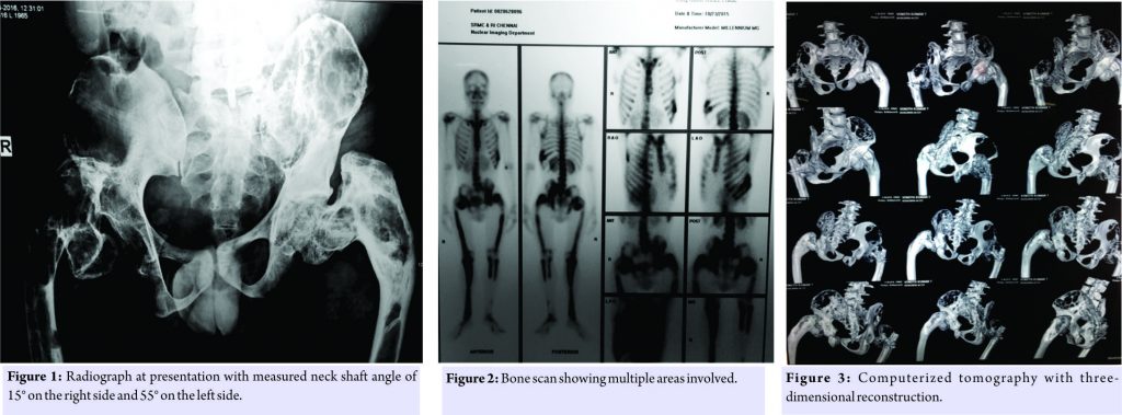 The term “Fibrous Dysplasia” was given by Lichtenstein in 1938 [1]. Fibrous dysplasia is a rarebenign disorder of the skeletal system. Fibrous dysplasia is a developmental anomaly of bone formation that may exist in a monostotic or polyostotic form. The hallmark is replacement of normal bone and marrow by fibrous tissue and small, woven spicules of bone [6]. Fibrous dysplasia can occur in the epiphysis, metaphysis, or diaphysis. Almost any bone in the body can be involved, but polyostotic form tends to involve the craniofacial bones, ribs, and metaphysis or diaphysis of femur and tibia more commonly. Lesions tend to be present on one side of the body. Deformities such as scoliosis and shepherd’s crook deformity are frequently encountered in the polyostotic form. The latter deformity is thought to be characteristic of the polyostotic form. It involves curvature in the proximal femur neck and proximal shaft resulting in coxa vara deformity. Associated abnormalities, such as sexual precocity, abnormal skin pigmentation, intramuscular myxoma, and thyroid disease, may be present. McCune-Albright syndrome refers to polyostotic fibrous dysplasia, cutaneous pigmentation, and endocrine abnormalities [2]. Mazabraud syndrome is polyostotic fibrous dysplasia with intramuscular myxomas. Malignant change has been reported occasionally with and without prior radiotherapy. The radiographic appearance is characteristic, with the lucent area having a granular, ground-glass appearance with a well-defined sclerotic rim [3]. Occasionally, biopsy is necessary to establish the diagnosis. The histopathological appearance is that of irregular woven bone spicules with a fibrous stroma [6]. Small areas of cartilaginous metaplasia and cystic changes may be present. Surgical treatment is indicated when significant deformity or pathological fracture occurs or when significant pain exists. Actual and impending pathological fractures are best treated with intramedullary fixation when possible [4]. Deformities are corrected by osteotomy with internal fixation. The lesions persist either partially or completely in spite of the vigorous treatment and tend to recur. However, the associated pathological fractures or the osteotomies done for the correction of the deformity have excellent union rates [8]. Shepherd’s crook deformity, which is mainly a metaphyseal deformity, the goal of treatment is to prevent the recurrence by achieving mechanical alignment of the proximal femur and then internally splinting it. Recurrence is common in the managed cases and is more commonly seen with simple curettage and bone grafting. The cases reported in the literature are mostly the unilateral cases with either a single stage or two-stage correction. We report a rare managed case of bilateral shepherd’s crook deformity of the proximal femur with impending fracture neck of femur in a case of polyostotic fibrous dysplasia.