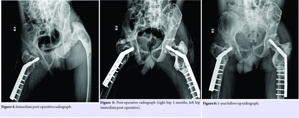 All the blood and serum biochemical investigations of the patient such as the hemoglobin, total and differential white cell counts, erythrocyte sedimentation rate, C-reactive protein, calcium, phosphorus, and alkaline phosphatase levels, and all the hormonal studies were within normal limits. It was decided to do correction of the deformity to realign the head, neck, and shaft and to achieve valgus at the neck shaft region, in one stage, each side at a time. On the right side, lateral closing wedge osteotomy was done at the subtrochanteric level to achieve alignment of the shaft with the proximal femur and fixed with a 135° dynamic Richard’s screw with a six-holed long side plate. 3 months later on the left side, lateral closing wedge osteotomy was performed at the subtrochanteric level to align the distal shaft with the proximal femur. Fixation was done using a 135° dynamic Richard’s screw with a six-holed long side plate to span osteotomy site. Postoperatively, we achieved a neck-shaft angle of 140° on the right side and 135° on the left side (Fig. 4 and 5). The patient was started on active and passive quadriceps strengthening exercises, and after 6 weeks of immobilization, toe touch weight-bearing was started followed gradually by partial and complete weight-bearing mobilization. Follow-up imaging showed union at both the osteotomy sites bilaterally. At present, at 12-month postoperatively (Fig. 6), the patient is walking full weight-bearing without support and there are no signs of recurrence of lesions of fibrous dysplasia or the deformity (Fig. 7 and 8).
