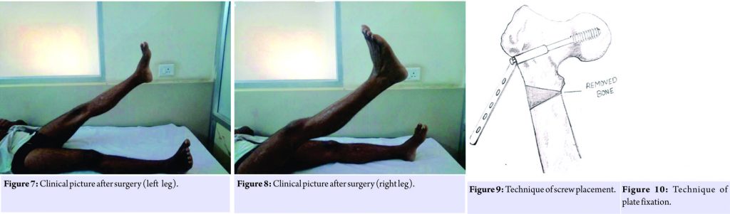Although pathologically fibrous dysplasia is described as a benign condition, clinically, it is associated with a significant morbidity and decreased quality of life, especially with lesions of the lower limb, like in our patient [5]. Our patient presented to us in his second decade of life with shepherd’s crook deformity of bilateral proximal femur and decreased quality of life. Every time shepherd’s crook deformity manifests in a different way and at a different stage; thus, a tailored approach should be adopted for treating them [4]. This is the reason of having varied ways described for approaching this particular deformity [3,4]. Irrespective of the customized approach chosen for the management of this deformity, it is of utmost importance to achieve the correct alignment and union. In our experience, dynamic hip screw fixation provides a more versatile method of fixing the shepherd’s crook deformity of proximal femur, the 135° plate with barrel will act as a template to correct the neck-shaft angle once the Richard’s screw is exactly in center of the neck and head of femur both in anterioposterior and lateral views (Fig. 9 and 10). Furthermore, a desired length of the side plate depending on the extent of lesion helps to span the lesion completely and prevent recurrence. Only the placement of the osteotomy will vary depending on the extent of the disease and the amount of deformity. Union of the osteotomy is usually not an issue, as once the mechanical alignment is achieved, union is usually achieved [7,8]. Correction of the shepherd’s crook deformity in single stage maximizes rehabilitation and also decreases the operative morbidity experienced by patient [9]. It is difficult to achieve single stage correction using an intramedullary implant as the femur is excessively bowed, and in such cases, dynamic hip screw fixation should be preferred [4,9]. Thus, valgus osteotomy with dynamic hip screw fixation is a versatile, effective, easier, and a practical approach to correct the morbid shepherd’s crook deformity of proximal femur.