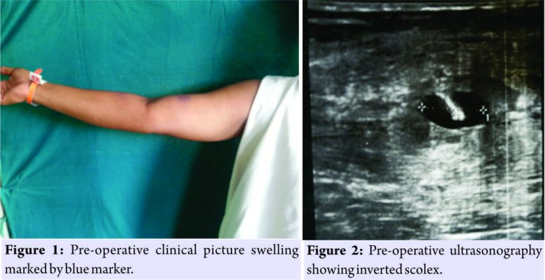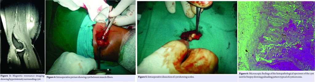 Case Report: A 32-year-old male, security personnel by occupation, comes with complaints of painful swelling of the right arm for past 1 week. There was no trauma to the limb and no similar swellings elsewhere in the body. On examination, there was an anteromedial tender swelling of mid-third of arm. X-ray was normal with soft tissue shadow on the anterior aspect. Ultrasound showed cystic lesion with central hyperechoic lesion. Magnetic resonance imaging of arm showed 7.7 mm × 4.8 mm lesion in anteromedial aspect of arm with surrounding edema s/o granuloma. The patient underwent excision of the cyst and biopsy was suggestive of cysticercosis and surrounding granuloma.